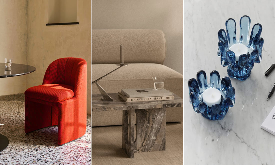 Röda statement-möbler, mjuka former och stilrena detaljer i sten...