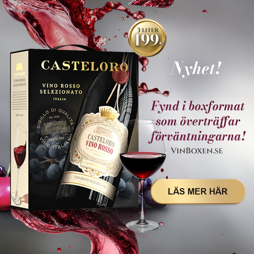 | Upptäck perfekta mat- & vinkombinationer! | | | Fyllig, fruktig och prisvärd box från Italien | | | Nu finns Casteloro Vino Rosso att beställa - ett smakrikt och fylligt rött vin i box till fyndpris: 3 liter för 199 kr! Casteloro är ett av Sveriges mest älskade vinvarumärken med storsäljare i flera kategorier, från Amarone och Ripasso till Prosecco. Den nya boxen bjuder på samma mustiga, generösa stil som producentens klassiska toppviner - fast till ett betydligt snällare pris. Med mörka körsbär, örter, torkade plommon och subtila toner av kryddor och choklad är det här vinet en given favorit till grillat, mustiga grytor, pasta eller bara ett glas i gott sällskap. Gjort på de lokala druvorna Corvina och Corvinone, skördade sent i oktober och lagrade på ekfat för extra koncentration och smak. | | | | | |