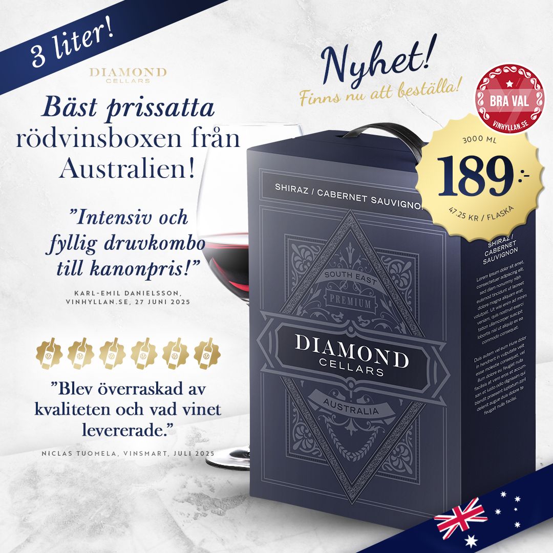 En diamant bland boxar under 200 kronor – Mats Claesson, folk o folk, september 2025 Intensiv och fyllig druvkombo till kanonpris! – Karl-Emil Danielsson, Vinhyllan, juni 2025 Blev överraskad av kvaliteten och vad vinet levererade – Niclas Tuomela, Vinsmart, juli 2025 4 av 5 poäng – Boxtoppen, augusti 2025 BRA KÖP! Shiraz + cab = fab – Jenny Asplund, Vinbörsen, augusti 2025 | | | | Diamond Cellars Shiraz Cabernet Sauvignon | Artikelnummer: 79744 | Alkoholhalt: 13 % | Volym: 3000 ml | | Doften är intensivt fruktig med nyanser av björnbär, svartvinbärssaft och kryddor. Smaken är medelfyllig och fruktig med toner av björnbär. svarta vinbär och mörka plommon. Eftersmaken avslutas med en viss fruktsötma. - Mats Claesson, Dryckesexpert folk o folk, September 2025 | 189 kr | | | | Vinbanken är en nyhetssajt och kunskapsbank som vill hjälpa dig som konsument att hitta de rätta vinerna för dig och ditt tillfälle. Hos Vinbanken ska du kunna hitta nyheter, trender och upptäcka smakkombinationer som du inte trodde fanns. Vinbanken bevakar alla produkter i Systembolagets sortiment. Vi tipsar endast om viner som du kan köpa via Systembolaget. Vinbanken och Systembolaget har inget kommersiellt samarbete. Detta är en annons från leverantören Anora Sweden AB. | | | | | |