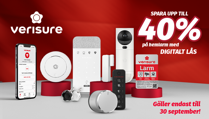 Upp till 40% på hemlarm med digitalt lås Verisure hemlarm är enkelt, tryggt och passar både hus och lägenhet. Just nu sparar du upp till 40% när du beställer hemlarm med digitalt lås – för en trygg och nyckelfri vardag. Passa på! Erbjudandet gäller bara t.o.m. 30 september. ✔️ Branschledande brand- och inbrottsskydd ✔️ Uppkopplat till Nordens största larmcentral ✔️ Snabb åtgärd vid inbrott, brand och nödsituationer ✔️ Styr lås och larm på distans ✔️ Rekommenderas av Folksam | Med Verisure får ni ett hemlarm som skyddar mot inbrott, brand och mycket mer. Larmet aktiveras redan innan tjuven tagit sig in i bostaden och från larmcentralen tillkallar vi väktare eller polis. Vid brand kan vi snabbt larma brandkåren, oavsett om du är hemma, ligger och sover eller är bortrest. | |