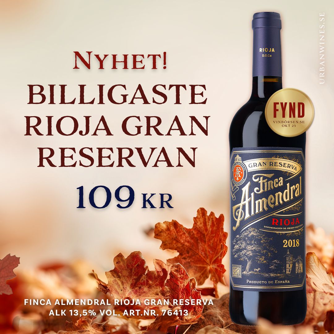 FYND! God, utvecklad doft med drag av plommon, örter, vanilj, choklad och kryddor. Gunilla Hultgren Karell, Vinbörsen, oktober 2025 | | | | | Finca Almendral Gran Reserva, 2018 | | Artikelnummer: 7641301 | | Alkoholhalt: 13,5 % | | Volym: 750 ml | | Finca Almendral Gran Reserva 2018 är ett vin med tydlig struktur där doften är inbjudande med mörka körsbär, plommon, örter och en försiktig ton av vanilj, kakao och torkade kryddor. Smaken är fyllig och stram med mörka bär, lakrits, choklad och en lätt pepprighet som ger både kraft och fräschör. Trots sina sju år på nacken känns vinet vitalt och levande i sin smak med ett rejält tanningrepp och ett syrligt avslut som väcker aptiten. Servera till viltrgrytor, lyxiga älgköttbullar eller en bit lagrad manchego. / AktuelltVin, oktober 2025 | | 109 kr | | | | Receptkort bevakar även alla produkter i Systembolagets sortiment tillsammans med sin samarbetspartner Vinbanken. Ihop tipsar vi endast om viner och drycker som du kan köpa via Systembolaget. Receptkort och dess samarbetspartners har inget kommersiellt samarbete med Systembolaget. Detta vintips är en annons från Receptkort som sponsras av importören Urban Wines AB. | | | | | |