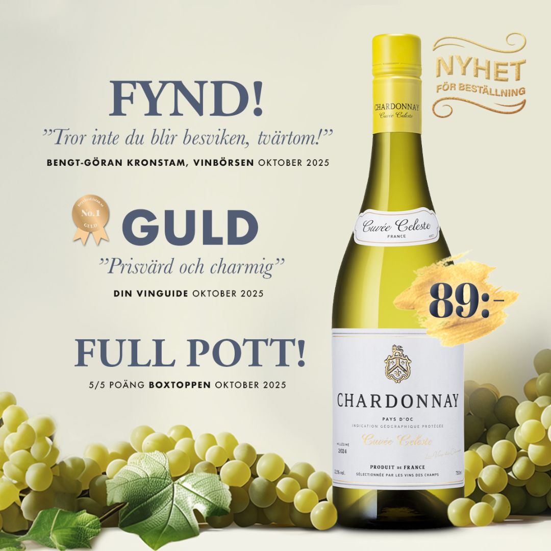 | | | Upptäck perfekta mat- & vinkombinationer! | | | | Fyndchardonnay - friskt, fruktigt och prisvärt | | | Upptäck en av årets mest prisvärda franska Chardonnayer - Cuvée Celeste 2024. Ett friskt, fruktdrivet och generöst vitt vin från soliga Pays d'Oc, framställt på 100% Chardonnay, drottningen av de gröna druvorna. I glaset möts du av en ren, fräsch och aromatisk doft. Här dominerar äppliga toner, gula stenfrukter, persika och citrus, rundat av en mjukt krämig textur tack vare lagring på jästfällningen. Smaken är lika charmerande: livlig, mjuk och otroligt lätt att tycka om. Ett vin som gör sig perfekt som aperitif men glänser lika väl till skaldjur, lax, kokt torsk, sallader eller en klassisk Skagenröra. Ett modernt, fräscht och stilrent vitt vin - fynd för 89 kr. | | | | | |