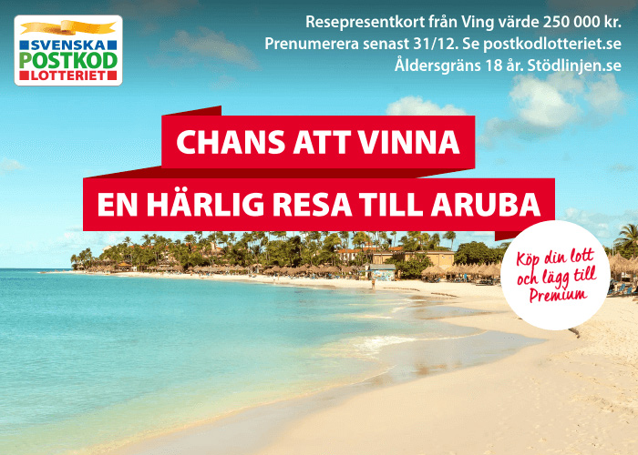 | Bli en vinnare och lämna kvarteret ett tag | Om du köper din Postkodlott och lägger till Premium kan du vinna ännu mer. Och snart har du chansen på presentkort från Ving för 250 000 kronor. Vart skulle du vilja resa? Aruba i södra Karibien är ett hett tips. Halva priset de tre första månaderna Nu får du de tre första månaderna för totalt 282 kr (ord. pris 564 kr) när du köper din Postkodlott. Då ingår alla ordinarie vinster. Om du vill ha chansen att vinna ännu mer och lägga till Premium, betalar du halva priset även där – totalt 60 kr för tre månader (ord. pris 120 kr). | | |