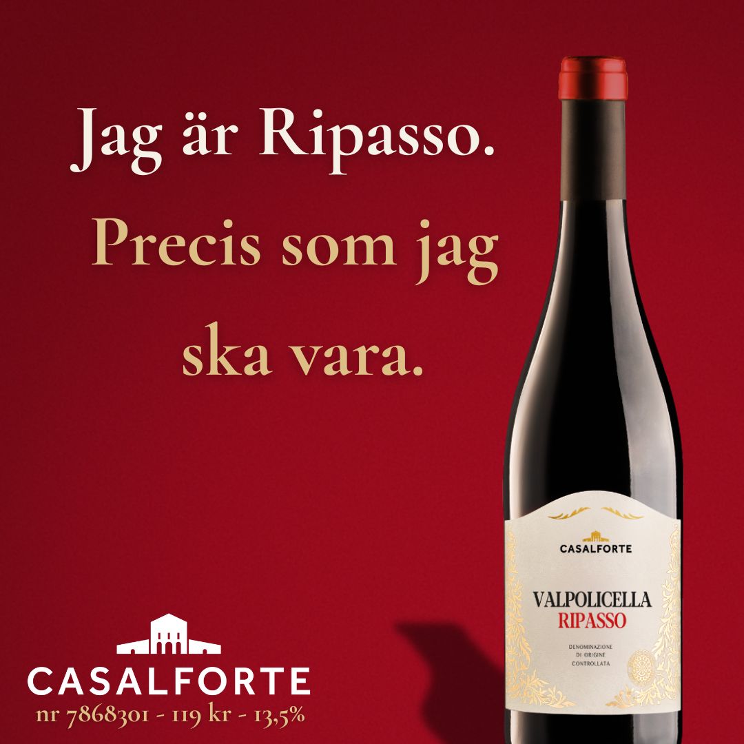 | | | Upptäck perfekta mat- & vinkombinationer! | | | | Ripasso - lika italienskt som pizza, pasta och dramatiska handgester | | | Ripasso är lika klassiskt som det är gott, och Casalfortes tolkning fångar essensen av Veneto i varje droppe. Det här är ett smakrikt, djupt och generöst vin som levererar allt man vill ha av en riktigt bra Ripasso. Redan i doften möts du av körsbär, plommon, torkade fikon och vanilj. Smaken är fyllig, mjuk och elegant med mörka bär, choklad och subtil kryddighet - och tanninerna? Silkeslena. Tack vare ripasso-metoden, där vinet får jäsa en andra gång på de kraftfulla druvresterna från Amarone, får Casalforte Ripasso sin karaktäristiska kropp, komplexitet och sötfruktiga ton. Casalforte Ripasso passar perfekt till kraftiga kötträtter, lagrade ostar och rustika italienska favoriter - eller när du bara vill ha ett klassiskt italienskt vin i glaset. | | | | | |